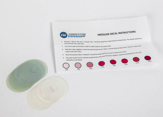 CSI's Pressure Discs are a great way to determine how hard the car is getting into the bump rubber. The decal changes color when pressure is applied, you then compare that color to the provided chart to determine how much load was generated. The kit comes complete with instructions. They are one time use and 10 come in a kit.